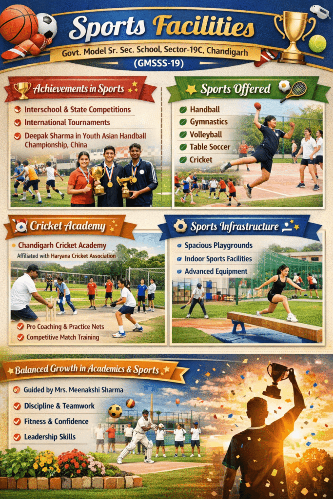 At GMSSS-19C, Chandigarh, sports and physical education are an integral part of the overall development of students. The school strongly believes in β€œA healthy body leads to a healthy mind”, and therefore provides excellent facilities and opportunities for students to excel in sports.
